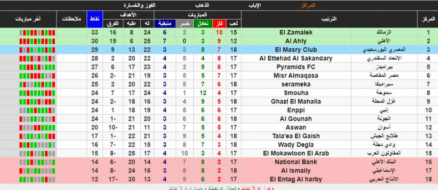 الدوري الإنكليزي الممتاز الدوري الفرنسي دوري أبطال أوروبا الدوري الإيطالي الدوري الإسباني الدوري الألماني. يقدم إليكم موقع آس آرابيا كل أخبار الدوري المصري فى تغطية مميزة ومباشرة لكل مباريات وجدول ترتيب الدوري المصري والفرق المشاركة وهدافي الدوري ونتائج المباريات. فضلًا أزل القالب لو لم تُجرى أي تعديلات كبيرة على الصفحة في آخر شهر. اختيار فريق بعينه أو بطولة مُعينة لتبدأ بمُشاهدة جدول المُباريات الخاص بتلك البطولة أو الدوري، وكذلك جدول ترتيب الفرق في هذه البطولة. ترتيب الدوري المصري الممتاز 2016/2017 متابعة كاملة لترتيب فرق الدوري المصري الممتاز لكرة القدم بالتفاصيل بعدد المباريات والفوز والتعادل والخسارة والنقاط لفرق الدوري.